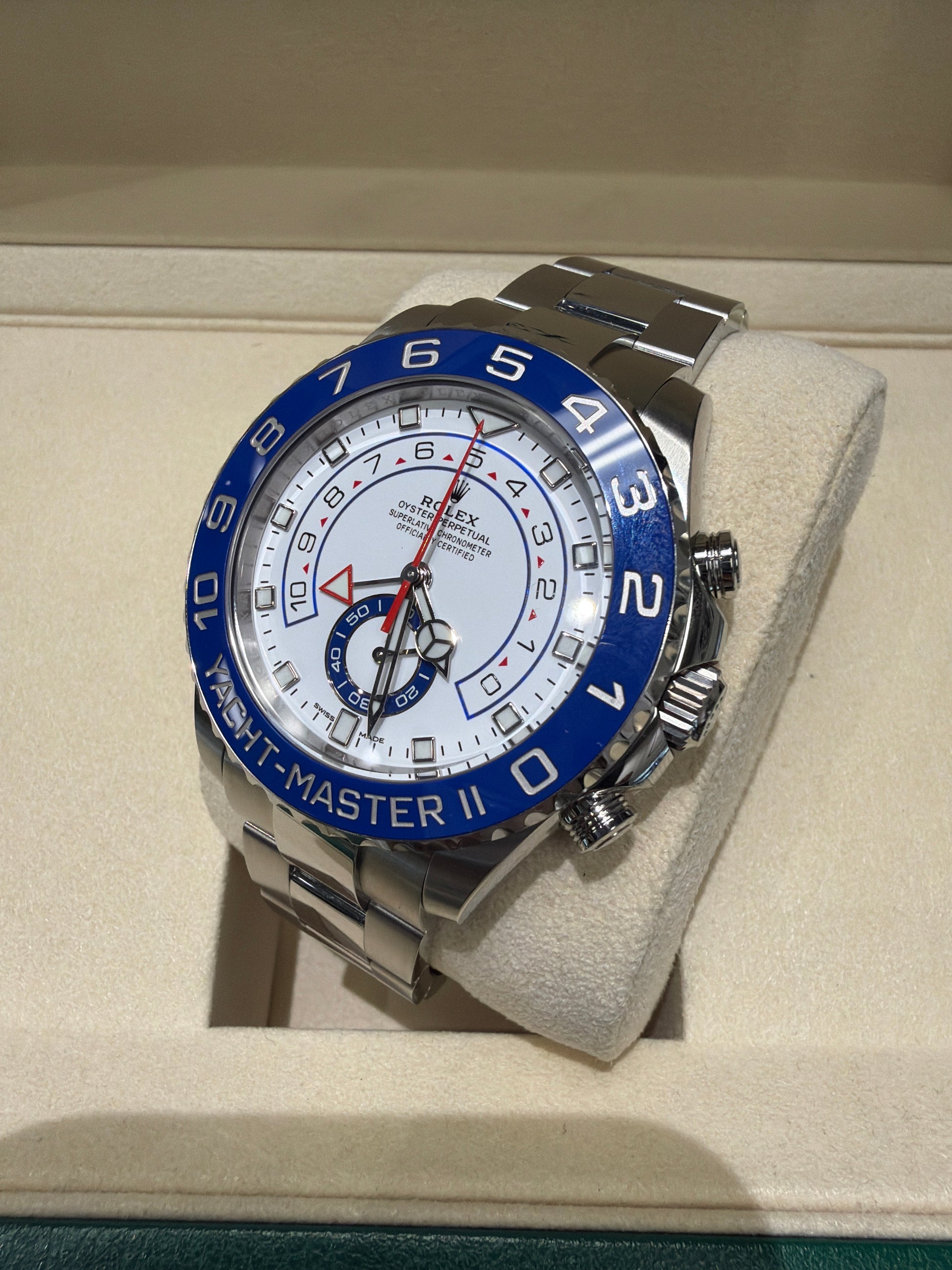 The Rolex Yacht-Master II in stainless steel is one of the most commanding and technical watches in the entire Rolex lineup. Designed for professional regatta timing yet worn today as a bold luxury statement, this model delivers unmatched wrist presence with its oversized case, crisp white dial, and signature Rolex-blue Cerachrom bezel.